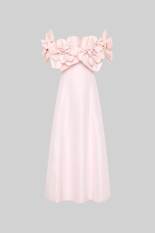 Off-Shoulder Midi Dress With Large Fabric Floral Accents - Pink