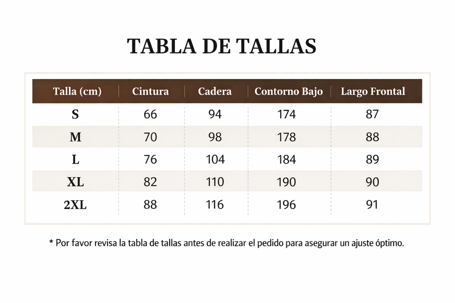 | Talla | Cintura (cm) | Cadera (cm) | Largo de falda (cm) |